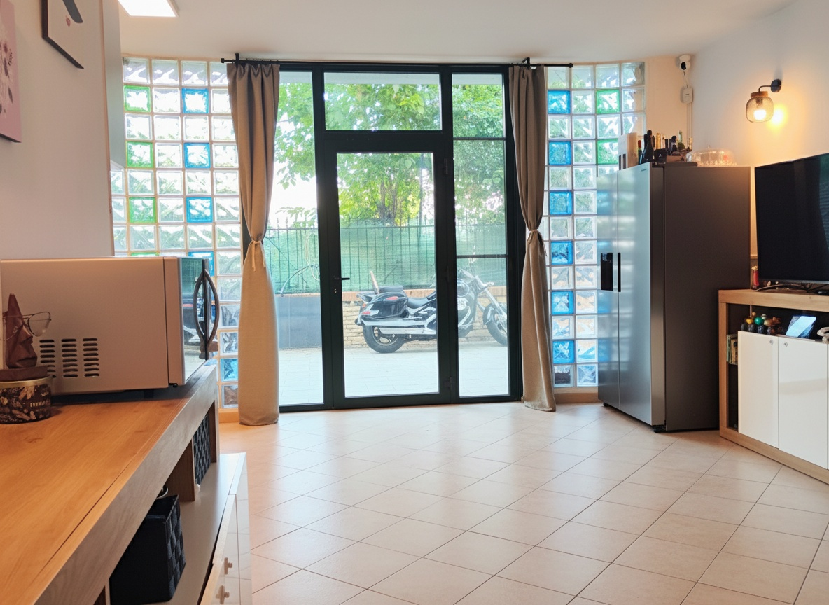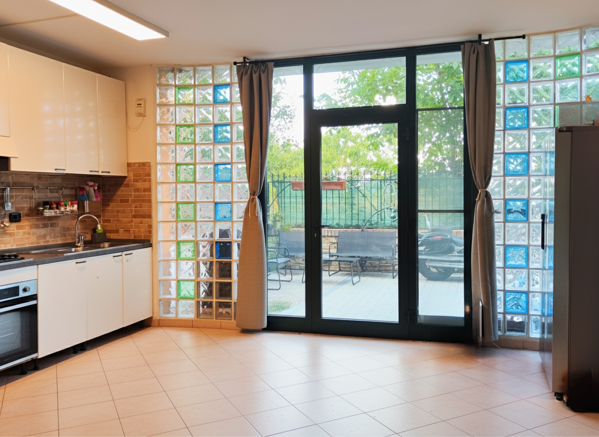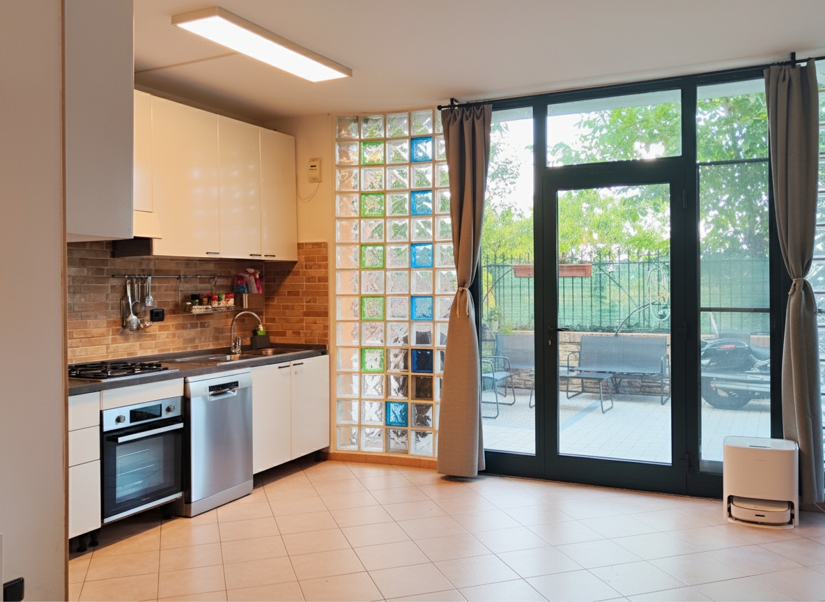 L’appartamento si apre su una luminosa zona giorno open space con affaccio diretto sul giardino privato, perfetto per chi desidera uno spazio verde da vivere in totale riservatezza.