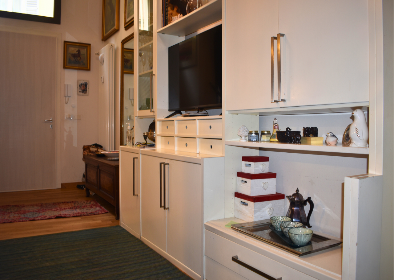 Un breve dislivello accompagna verso un secondo spazio living, perfetto come piccolo salottino o area personale, da cui si accede alla camera matrimoniale dotata di cabina armadio particolarmente generosa per un immobile in posizione così centrale.