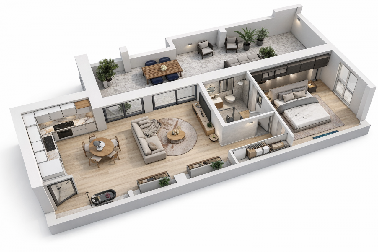 L’ingresso conduce ad una luminosa zona giorno con cucina a vista, studiata per offrire continuità tra gli ambienti e massima funzionalità, con affaccio diretto su una splendida terrazza profonda e sfruttabile, ideale per momenti di relax all’aperto. La zona notte accoglie una camera matrimoniale accogliente, anch’essa collegata agli spazi esterni, mentre il bagno si distingue per finiture moderne e materiali di qualità, con doccia walk-in e arredi dal design contemporaneo.