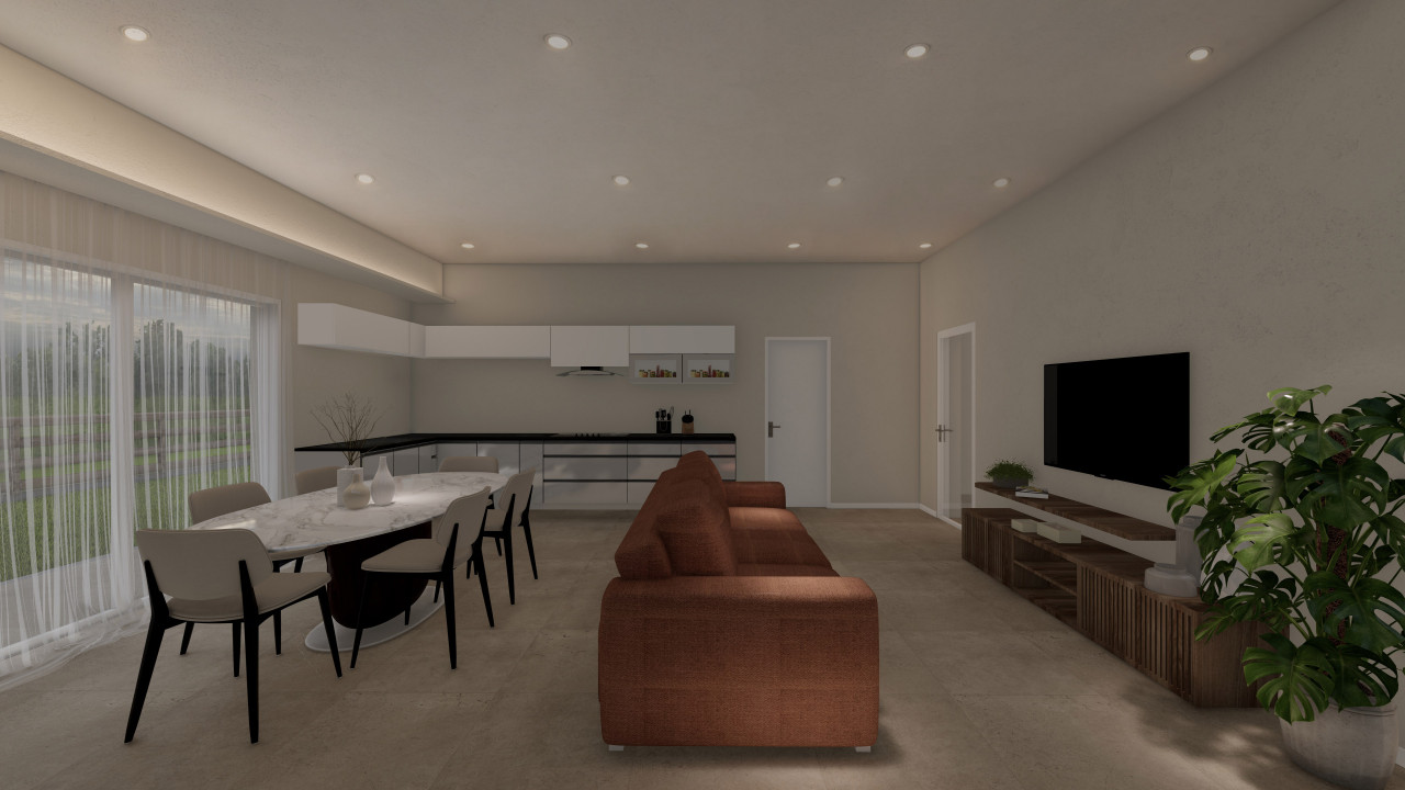 Le due porzioni, indipendenti e collegate unicamente dal garage, si sviluppano su un unico livello e offrono ambienti luminosi, equilibrati e facili da vivere. La zona giorno open space diventa il centro naturale della casa, mentre le tre camere, il bagno moderno e la lavanderia rispondono alle esigenze di una famiglia che cerca comfort e funzionalità senza compromessi.